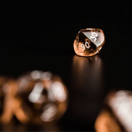 Set of gaming dice with copy space on brown background. Concept for games, game board, role playing game, risk, chance, good luck or gambling. Toned image top view. Close-up.