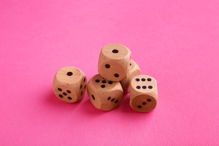 Many wooden game dices on pink background