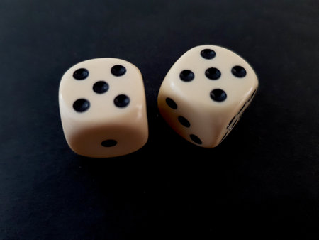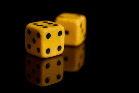 Gambling. Two dice on a black background with reflection, copy space. horizontal format