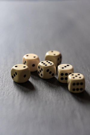 Several dice lie on a neutral, dark stone slab. Cubes