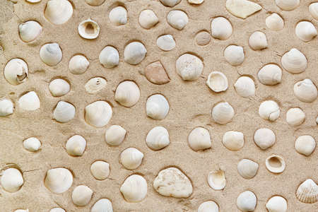 Sandy beach with seashells. Summer beach background.