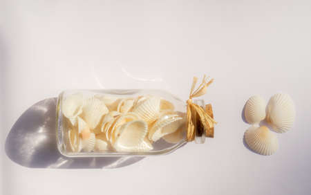 Horizontal photo of a glass bottle with cockle sea shells