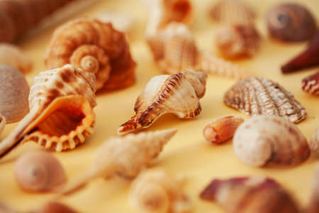 a lot of different empty sea shells on yellow background, macro details
