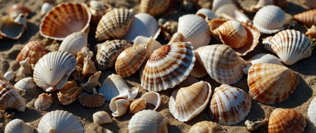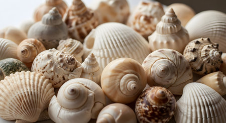 A captivating close-up of numerous seashells, showing their unique textures and colors. A tranquil summer beach scene.