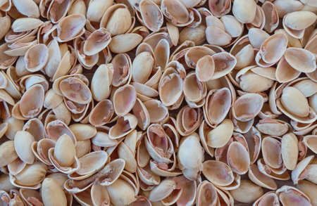 Background with empty pistachio nuts without kernel.