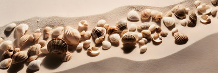 Seashells scattered on a serene beach with soft sand and gentle waves in the background, capturing the peaceful essence of a coastal environment. ideal for themes of relaxation, holidays, and natural beauty.