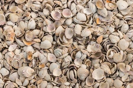 Many seashells as background, close up. Summer backdrop