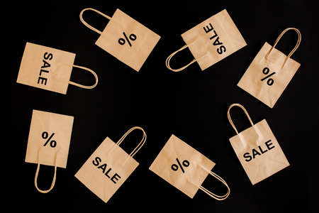 Black Friday sales discount concept. Craft paper bags with word Sale on black background.