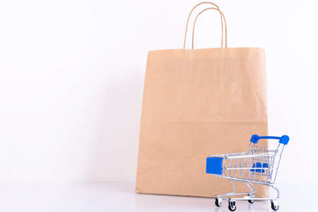 Shopping trolley, supermarket trolley, craft paper bag, on a white background. Copy space.