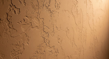 A close-up view of a textured beige plaster wall with an uneven, rough finish. Warm light illuminates the surface from above, casting shadows and...