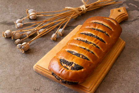Sweet roll with poppy seeds and dry poppy boxes. Delicious poppy seed bread or strudel