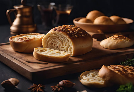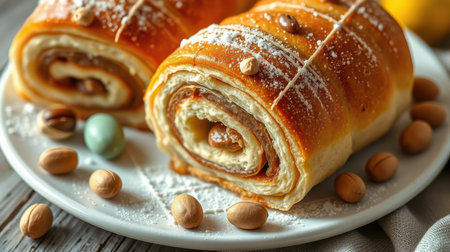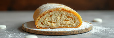 Delicious rolled pastry filled with creamy filling, beautifully presented on a wooden board