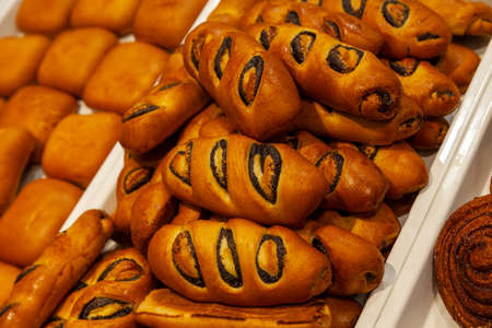 Appetizing big golden buns with poppies in the form of rolls, cooked according to homemade recipe, laid out in a showcase of a grocery store in the bakery department