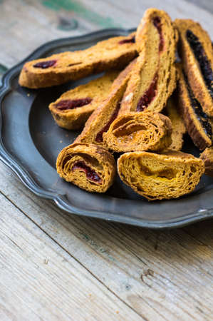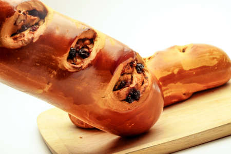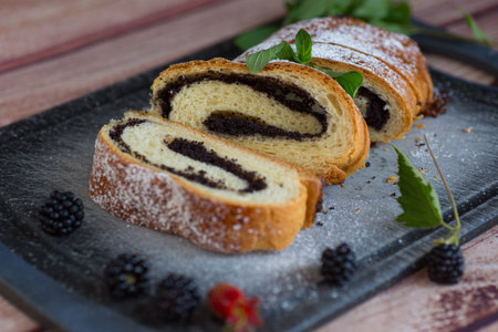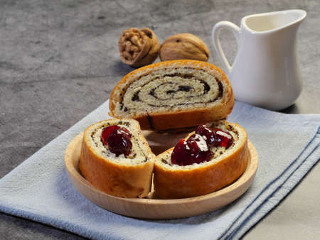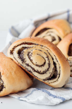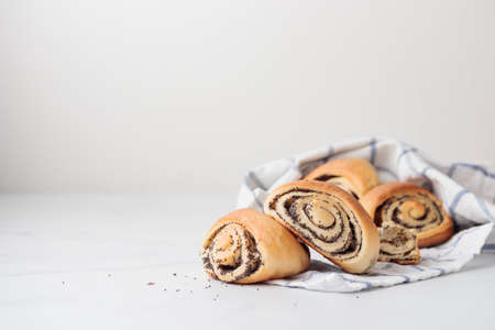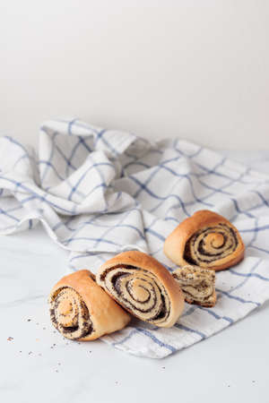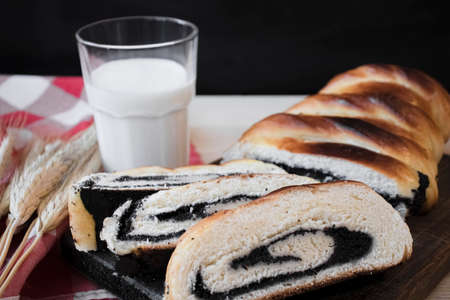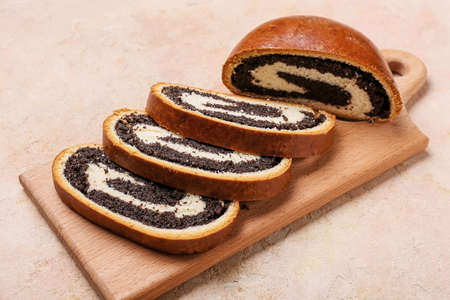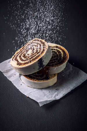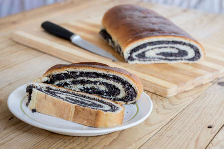 sweet pastries, roll with poppy seeds inside on a wooden table.