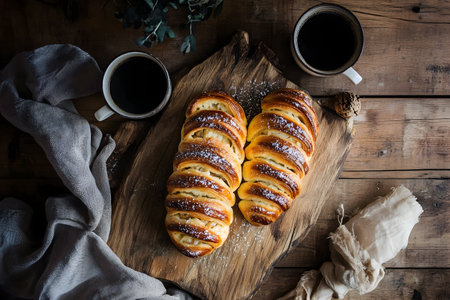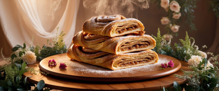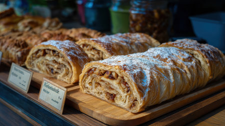 Freshly baked apple strudel cooling on a wooden platter with copy space, perfect for a bakery or cafe menu