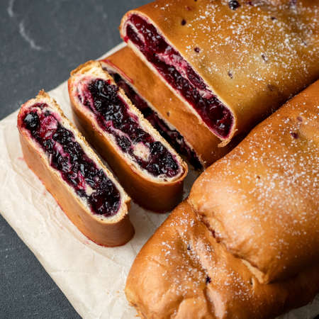 Strudel with cottage cheese sprinkled with powdered sugar cut close-up on a black background