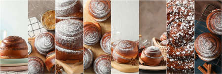 Food collage of tasty cinnamon rolls with powdered sugar. Delicious dessert