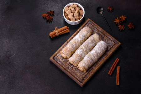 Freshly Baked Chocolate Rolls with a delicious filling, sprinkled with powdered sugar. Against the background of brown craft paper