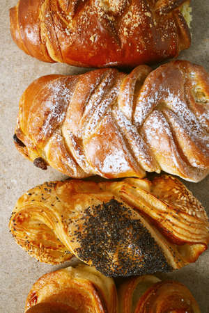 Sweet bread, easter tsoureki cozonac background, top view. Braided brioche, festive traditional challah closeup view