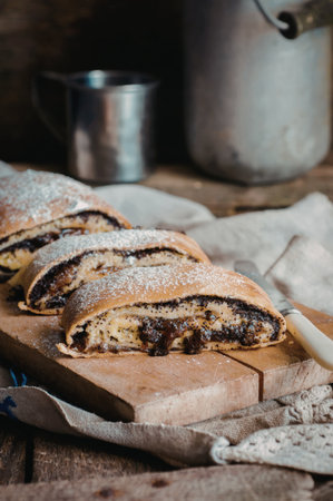 Poppy seed strudel on wooden rustic table. Traditional christmas strudel or Roll cake
