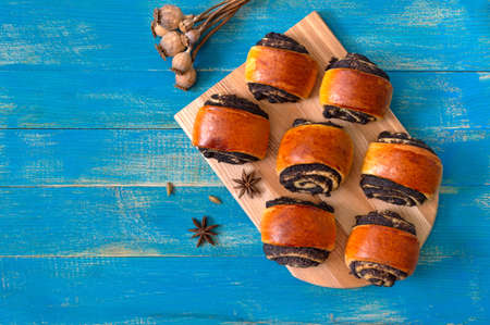 Tasty buns rolls with poppy filling on a blue wooden background. The top view