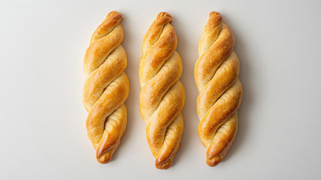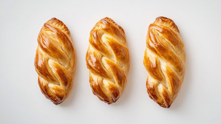 A minimalist shot featuring three golden brown empanadas arranged neatly, showcasing their intricate braid design and inviting texture. Perfect for food-related projects.