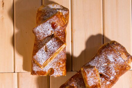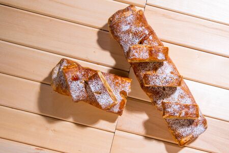 Roulade with apples, strudel sliced ??into pieces on a wooden background, close-up