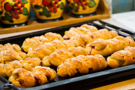 Hot, fresh golden brown baked homemade sweet pies, strudel