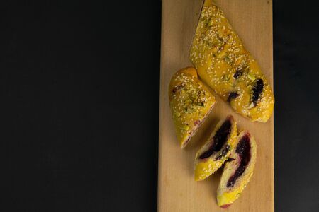 Freshly prepared puff pastry with cherry and sesame seeds close-up in a black background. Details The concept of home baking, breakfast, snack.