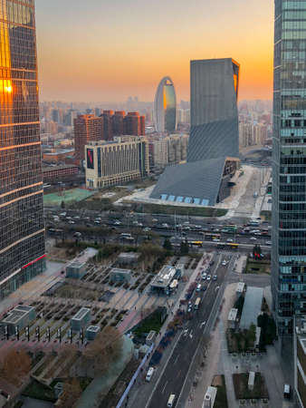 Towers in Central Business District of Beijing during sunrise. Beijing, China. September 13th, 2020