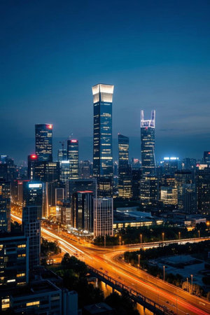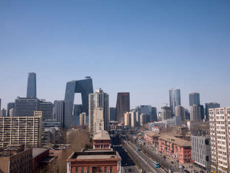 Aerial view of the city skyline of China World Trade Center in Beijing at dusk in a cloudy day