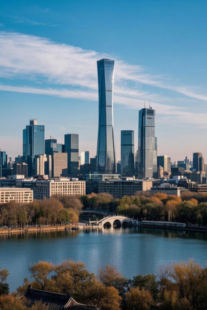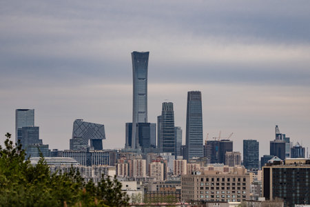Iconic skyscrapers of Beijing including China Zun and CCTV Tower rise behind green treetops under a partly cloudy sky