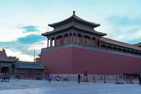 Side view of Tiananmen Gate of the Forbidden City at sunset, in Beijing, China