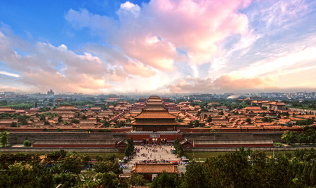 Aerial view of the Forbidden City at sunset, Beijing, China