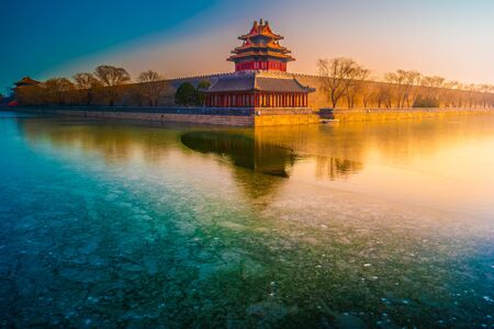 The wall and frozen moat of the Forbidden City at sunset. Beijing, China.