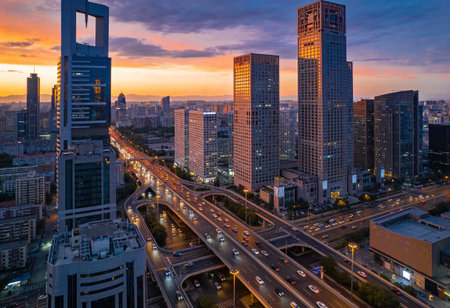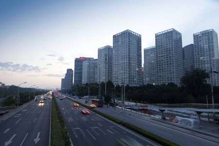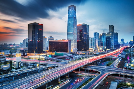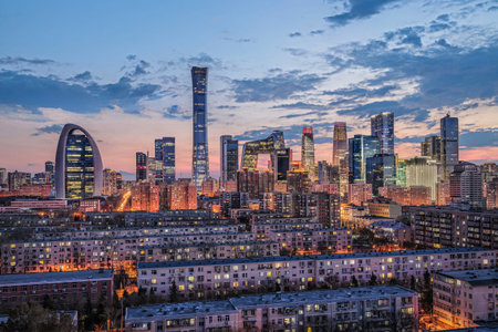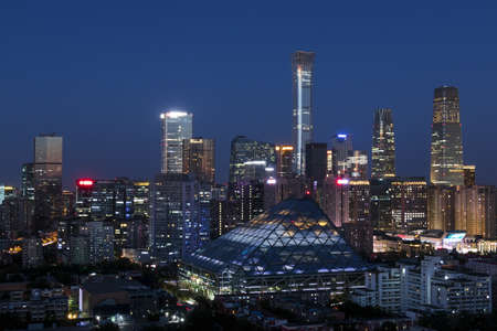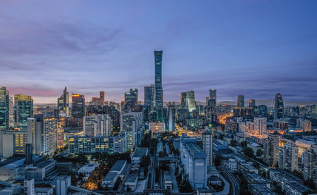 Aerial view of the city skyline of China World Trade Center in Beijing at dusk