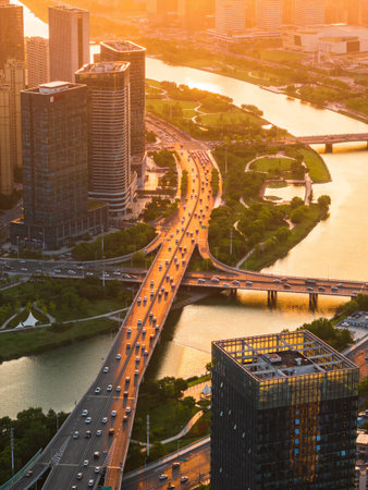 Aerial view of Shanghai Pudong bridge at sunset, China.