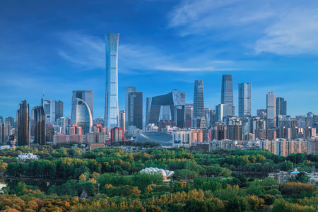 Panoramic view of Beijing's Guomao CBD skyline featuring the iconic China Zun, CCTV Tower, and green urban park under clear blue sky.