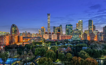 Panoramic view of Beijing's Guomao CBD skyline during blue hour, featuring the iconic China Zun and illuminated skyscrapers under twilight sky.