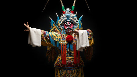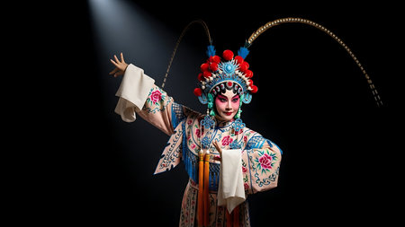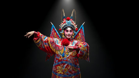 Chinese opera performer wearing elaborate traditional costume and makeup, posing with stylized hand gestures, showcasing rich culture, art, and ancient tradition on a dark background