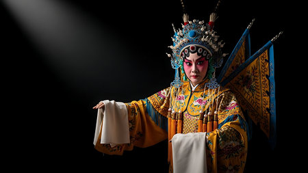 Chinese opera actor in traditional costume on dark background with bright spotlights
