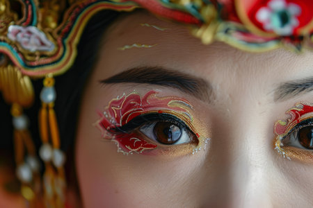Detailed view of a performers eyes with intricate chinese opera makeup and headpiece