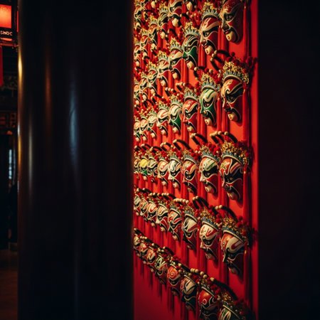 Terracotta masks on a red wall in a Chinese temple