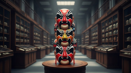 An environmental, cinematic wide shot (16:9) capturing a stack of five highly colorful Chinese opera