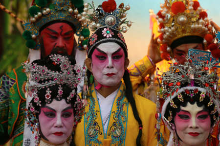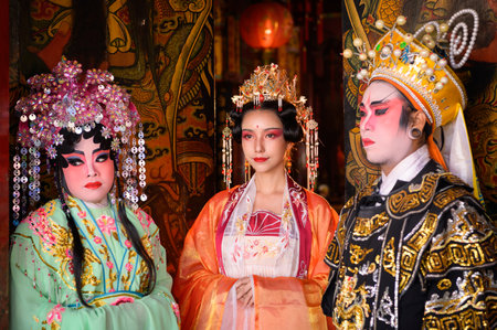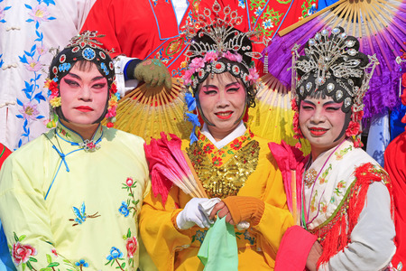 Portrait of male and female opera performers at the entrance to a sacred shrine or temple, praying for blessings on the occasion of the annual Chinese New Year.