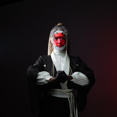 A young woman in fantastic makeup and an Asian kimono, the image of a cyber geisha. Close-up portrait