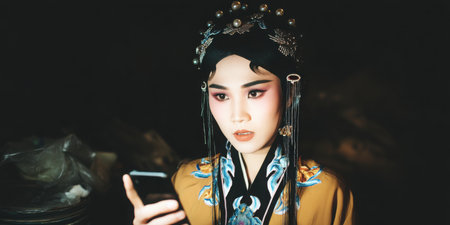 A captivating portrait of a young woman in beautiful traditional Chinese attire, deeply engaged with her smartphone. The contrast of modern technology and cultural heritage creates a striking visual narrative.