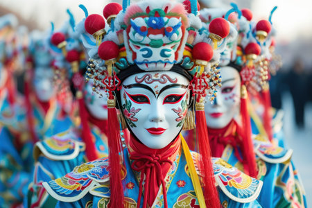 Face Paint and Accessories Focus on a performer in a s costume with colorful face paint and ornate headdress emphasizing the cultural significance and artistic expression in the.