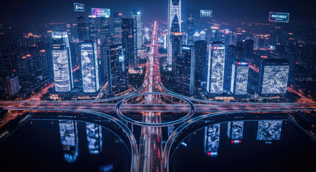 A city skyline at night, illuminated by countless lights.