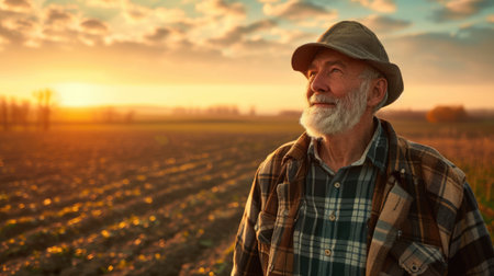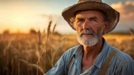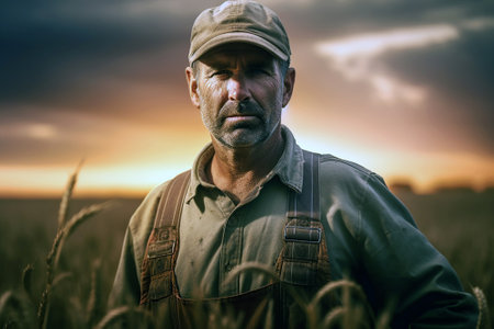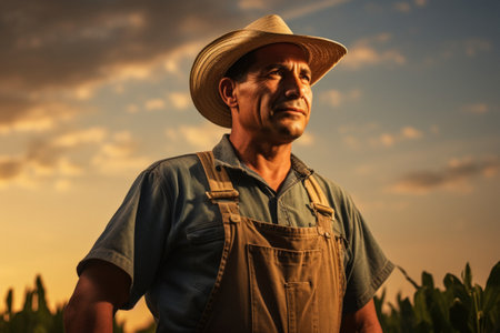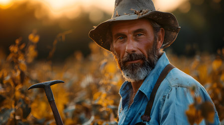 Rugged farmer wearing a hat and overalls standing in a field at sunset, exuding experience and determination